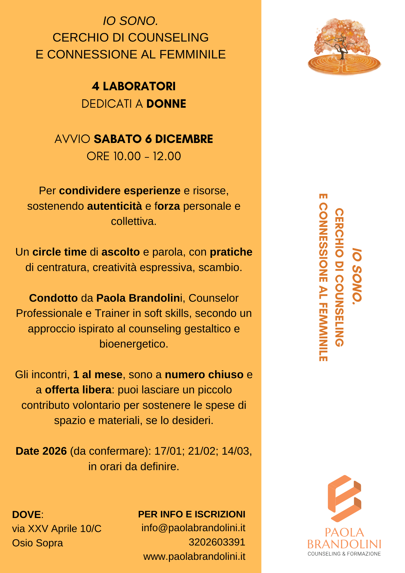 Condotto da Paola Brandolini, Counselor Professionale e Trainer in soft skills, secondo un approccio ispirato al counseling gestaltico e bioenergetico.